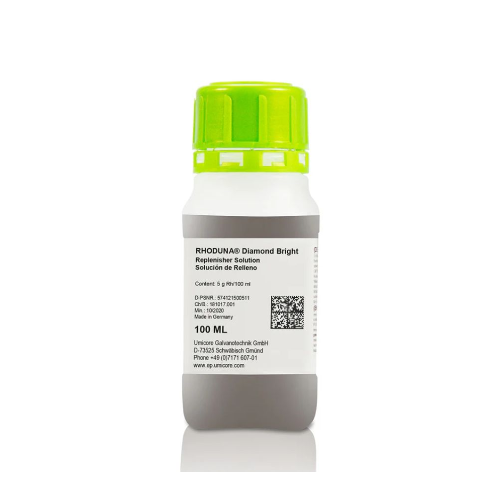 Umicore Diamond Bright Rhodium Replenisher is used to restore rhodium to your Umicore Diamond Bright bath as it becomes depleted. Available in a 5 gram concentration. Do not use rhodium solution itself to replenish; doing so will upset the bath’s chemical balance.